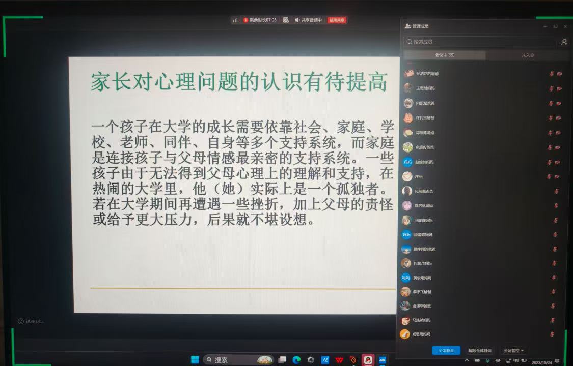 10月20日至24日,由学生处主办、心理健康教育中心承办的新生家长心理大讲堂活动圆满结束。本次讲座由原东南大学心理健康教育中心主任郭晋林老师担任主讲,以“大学生入学适应期的心理挑战与家校协同支持策略”为核心展开,2025级全体新生家长聆听了此次讲座。