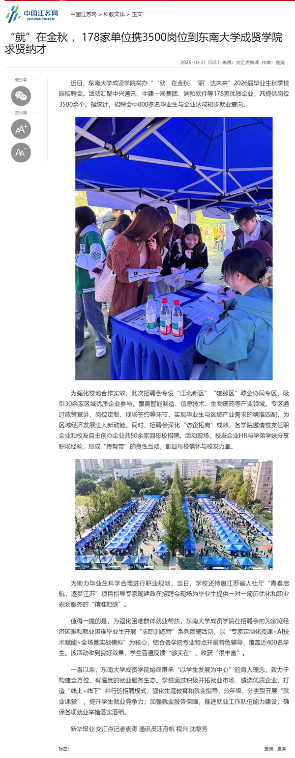 【中国江苏网】“就”在金秋,178家单位携3500岗位到东南大学成贤学院求贤纳才