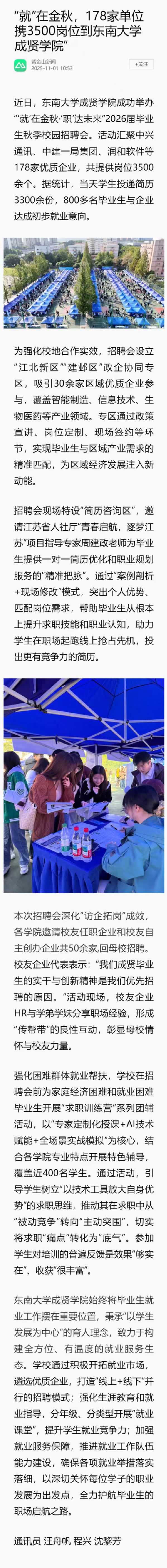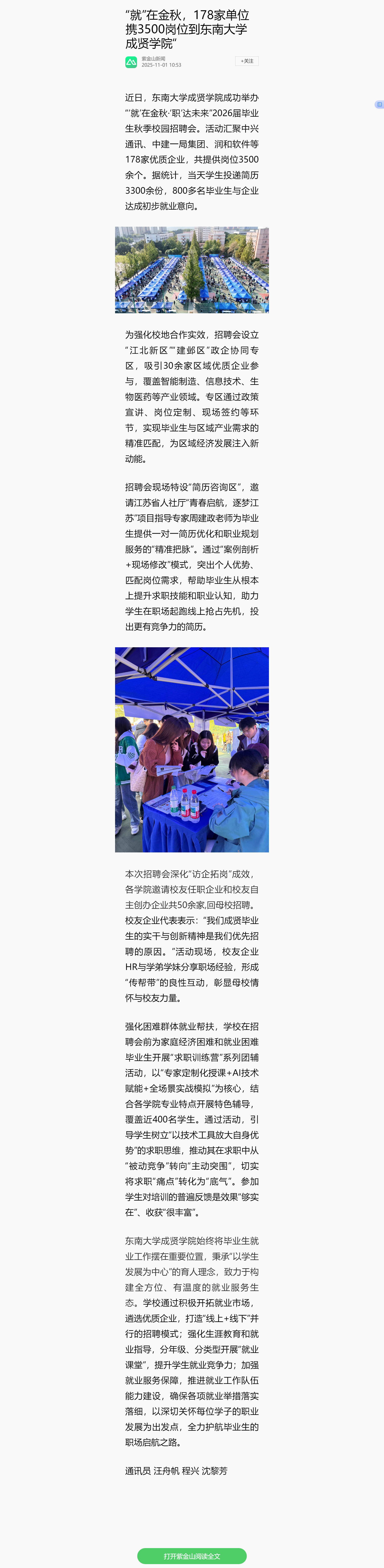 【南京日报/紫金山】“就”在金秋,178家单位携3500岗位到东南大学成贤学院“