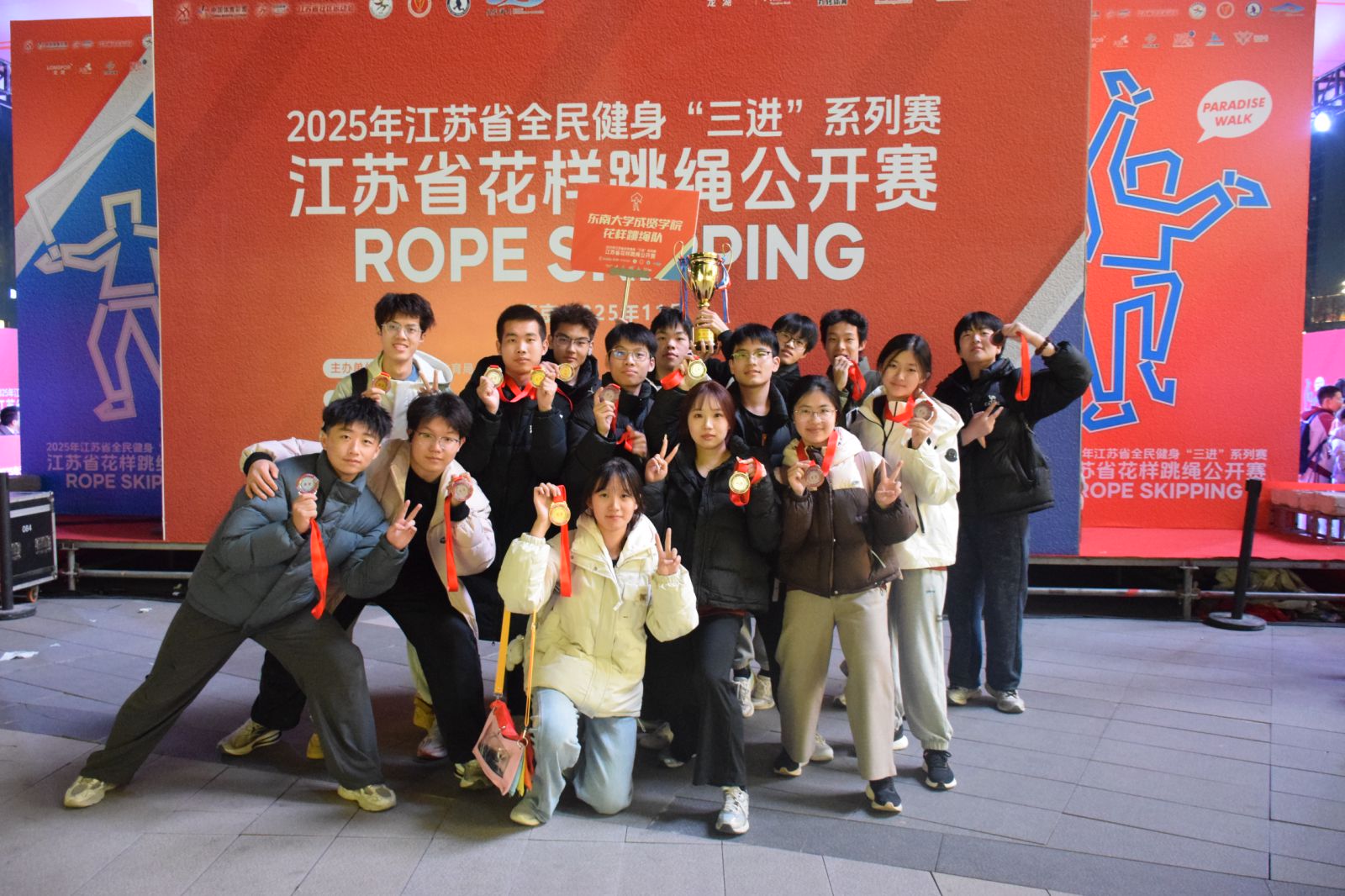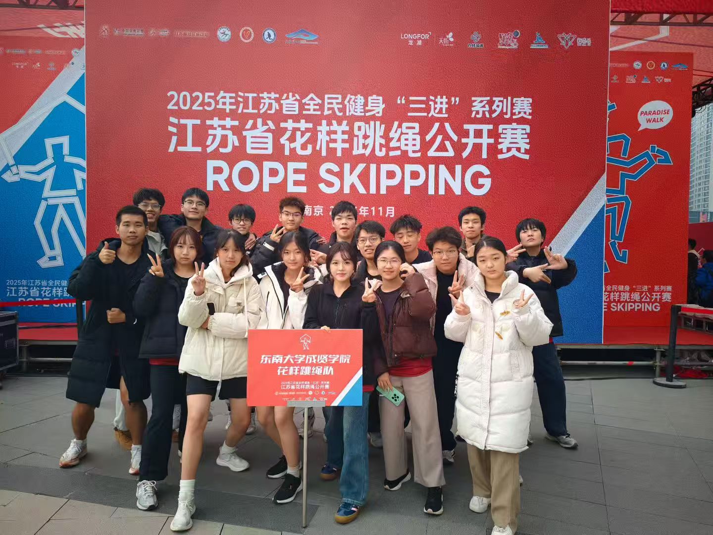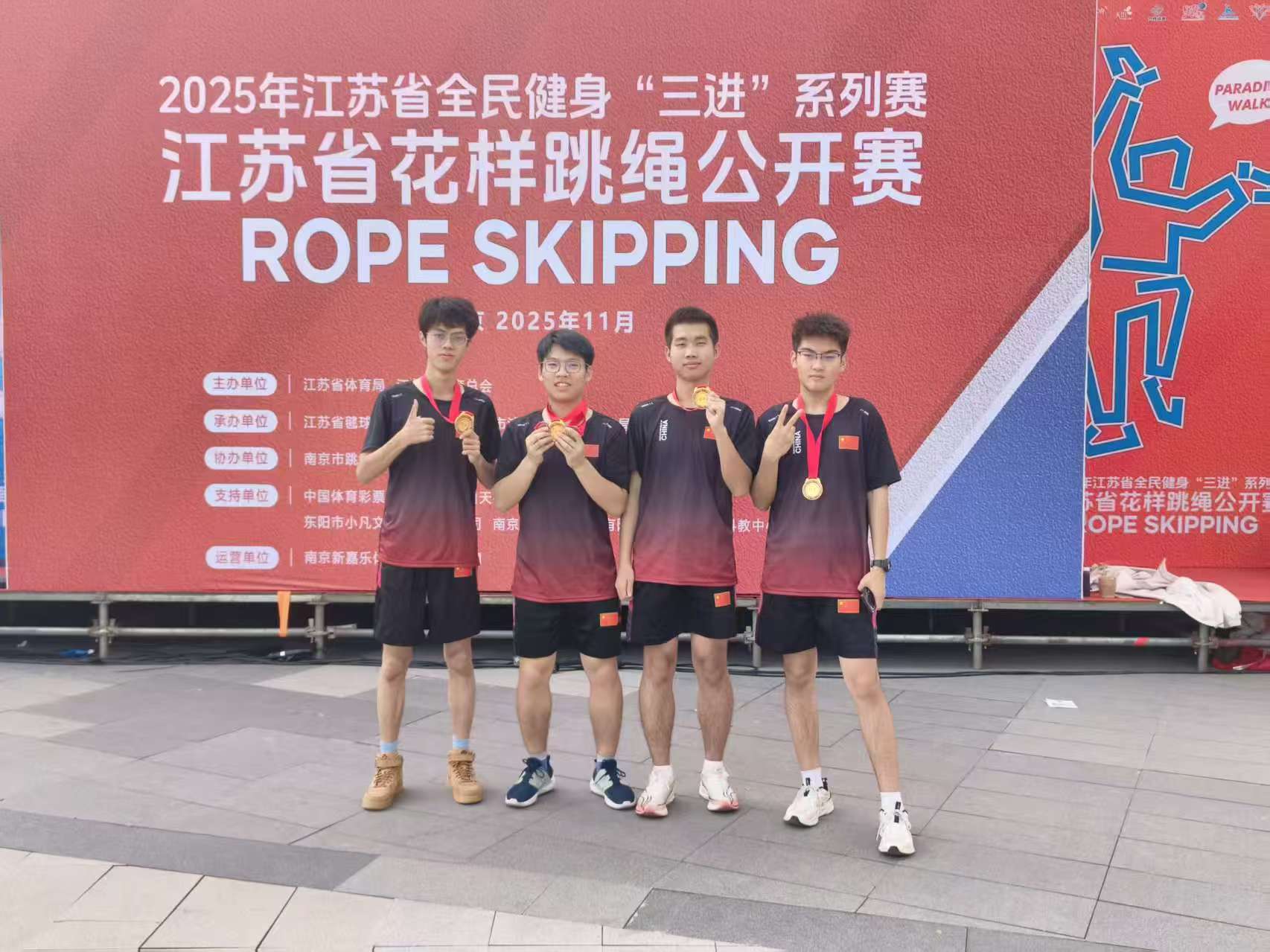 11月23日,江苏省全面健身“三进”系列赛—江苏省花样跳绳公开赛圆满落幕。东南大学成贤学院跳绳队在体育教研室主任王青禾老师指导和教练夏鹏宇的带领下,队员们在赛场上火力全开,凭借扎实的训练功底与默契的团队配合,一举拿下两金、两银、两铜的亮眼成绩!展现了成贤学子的运动风采!