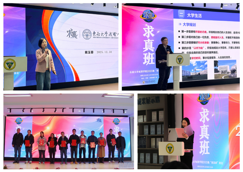 薪火相传求真志,弦歌不辍育新才。2025年12月30日,我校2025级“求真班”主题班会在求真・求美创新工坊举行。学校副院长戴玉蓉、教务处处长金辉、学生处处长施杰、教务处副处长陈雪琼、学生处副处长颜秉明出席会议,电子与计算机工程学院王文平老师担任该班辅导员并主持班会。2025级“求真班”全体学子与导师代表齐聚一堂,现场既洋溢着青春学子的蓬勃朝气,更充盈着求真务实的治学氛围。