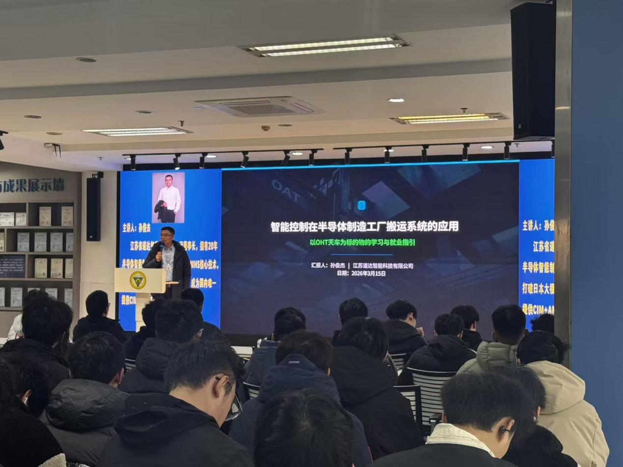 3月17日,由机械与电气工程学院举办的聚焦“智能控制在半导体制造工厂搬运系统的应用”专题讲座在创新工坊成功举办。本次讲座由江苏省道达智能科技有限公司董事长孙俊杰先生主讲,会议由机械与电气工程学院党总支副书记羊栋老师主持,学院200余名师生聆听了此次讲座。