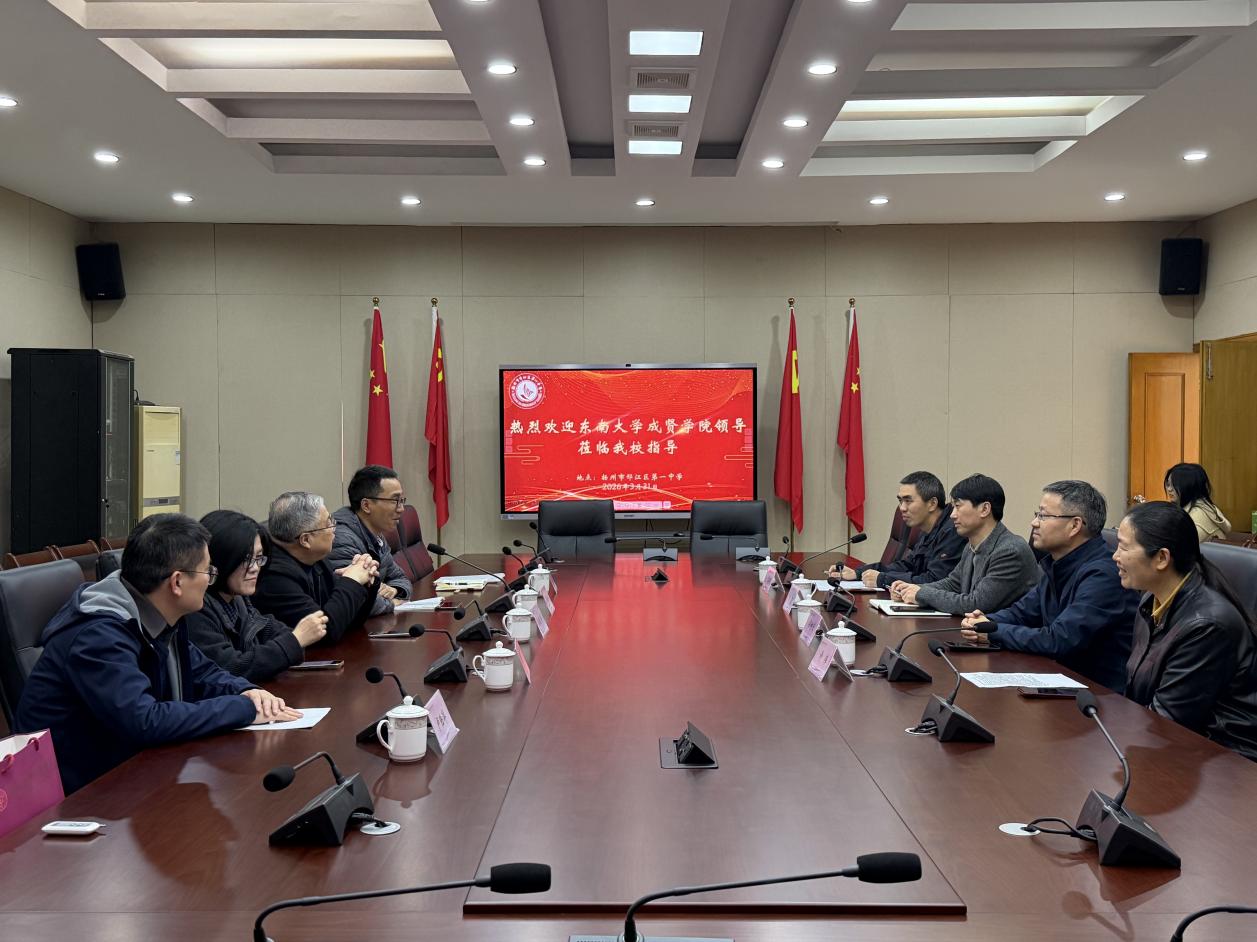 在扬州市邗江区第一中学,学院一行与副校长陶飞、梁树来、许伟及教务处主任严高明座谈交流。自2023年以来,两校交流往来密切,实现高校与高中教育教研、实践资源的双向互通共享。座谈期间,双方围绕丰富研学实践活动形式、优化人才培养衔接机制、深化学科共建交流等话题交换意见,一致认为要为中学生搭建更优质的升学发展平台,推动基础教育与高等教育协同发力、共育英才。