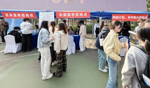 为全方位、一站式服务毕业生求职,学生处联合人武部、校团委、发展合作处在现场特设“征兵宣传咨询点”“西部计划、乡村振兴咨询点”“境外升学咨询点”三大服务专区。各专区由专人负责,为毕业生解读各类政策信息、报考流程、申请条件等,提供全面的指导服务,引导毕业生树立理性择业观,鼓励大家扎根基层、报效祖国,实现人生价值。