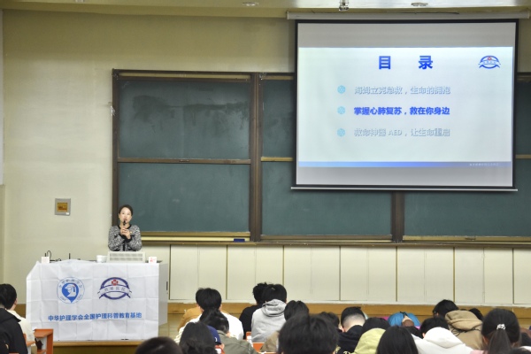 活动第二阶段,在华馆101教室南京鼓楼医院江北院区护理专家团队带来《守护青春,“救”在身边》主题讲座,面向广大学子普及应急救护与健康防护知识。讲座现场,急诊护士长柯菊青细致讲解海姆立克急救法适用场景与操作要点;心血管内科护士长陈珺系统科普心肺复苏规范流程及AED除颤仪实操使用方法;神经内外科护士长徐佳围绕癫痫常见诱因、发作表现与科学应对措施开展健康科普门诊护士长唐茜、肺外科护士长毛玉琴配合开展现场实操示范,手把手拆解动作细节。互动环节中,学生主动上台模拟练习,专家现场纠错指导,切实提升同学们应急处置实操能力。