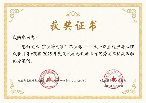 高校思想政治工作优秀文章征集活动由教育部高校思想政治工作队伍培训研修中心(山东大学)组织,旨在深入学习贯彻习近平新时代中国特色社会主义思想,全面落实党的二十大和二十届历次全会精神,学习贯彻全国教育大会精神。我校辅导员作品能够成功获评优秀案例,充分印证了学校辅导员队伍建设成效,彰显了全体辅导员实干笃行、深耕细研的优良作风,展现出扎实的业务功底与优秀的育人工作水平。