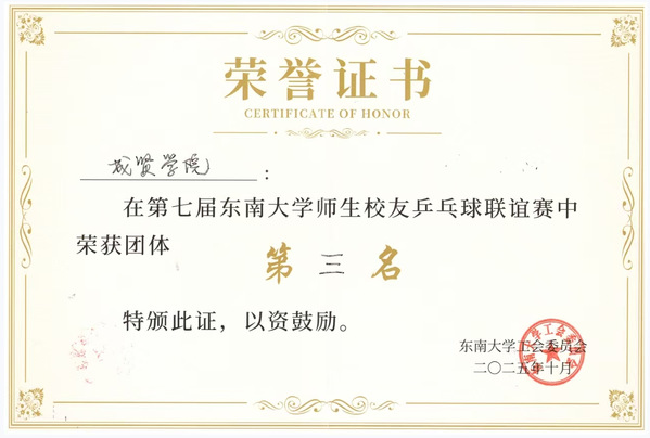 10月18日,第七届东南大学师生校友乒乓球联谊赛在东南大学体育馆圆满落幕。成贤学院代表队在体育教研室主任王青禾的带队下实力出征,由校工会文体委朱龙舜任领队,校友及师生代表周远昭、陈文正、鞠益珉、徐艺菲、郭泽宇组成的五人团队,在36支参赛队伍的激烈角逐中,凭借精湛的球技、默契的配合与顽强的拼搏精神,一路过关斩将,最终荣获团体第三名的优异成绩。